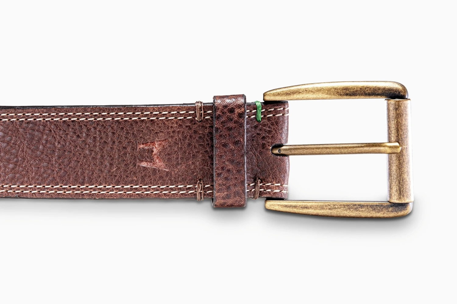 Our Buckle Up belt exemplifies casual sophistication. A true “belt for all occasions,” it looks equally at home paired with jeans, khakis, or slacks. It features textured leather, a slightly oversized, antiqued brass roller buckle, and nubuck lining. Made in the USA of Italian leather. For best fit, we recommend sizing up 2 inches from your normal pant size. For example, if you normally wear a size 36 pant, choose a size 38 belt.