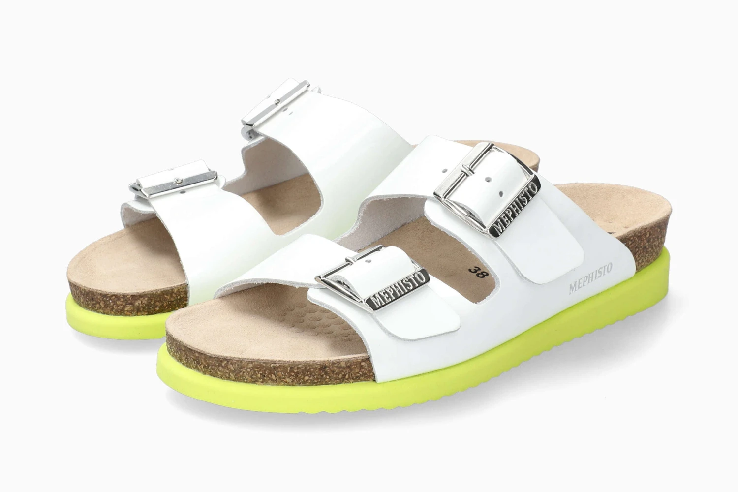 A sandal with timeless appeal and Bohemian charm, this laid-back mule is a must for concerts, wine tasting, bonfires, and more. With a wide range of both classic and trendy styles and finishes that include suede, full-grain, or nubuck leather, you can find exactly the vibe (or vibes) you’re going for. The leather-lined footbed and cork midsole offer outstanding, luxurious comfort for long stretches on your feet – and that’s a good thing, because if it’s happening, you’re there. Look great, feel even better. These are going to be your go-to, go-anywhere sandals for years to come. This white mule for women is made from patent leather.