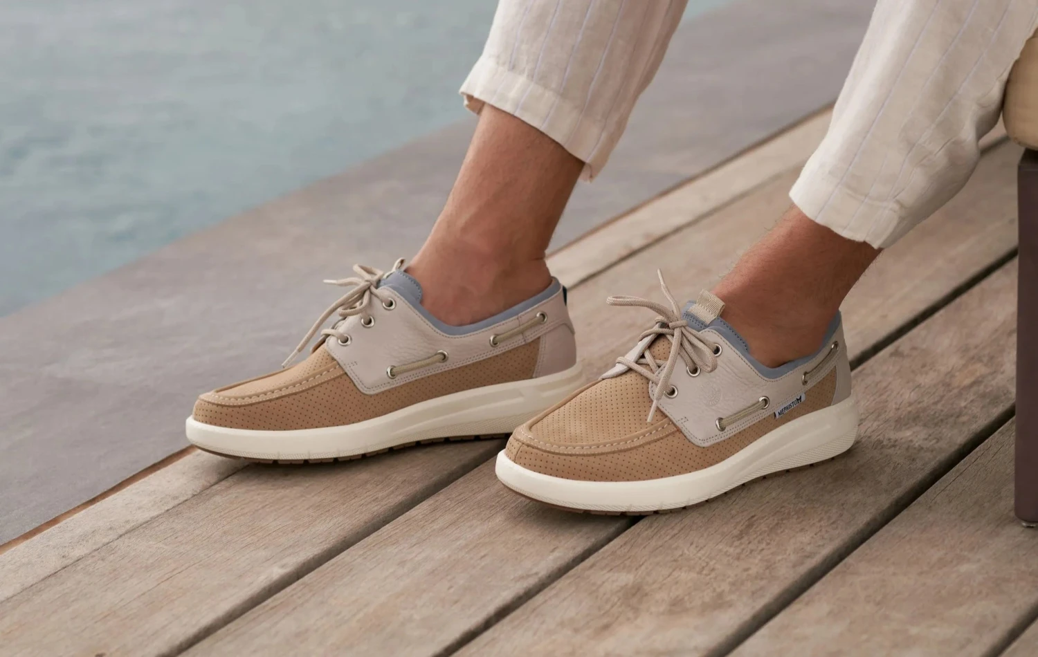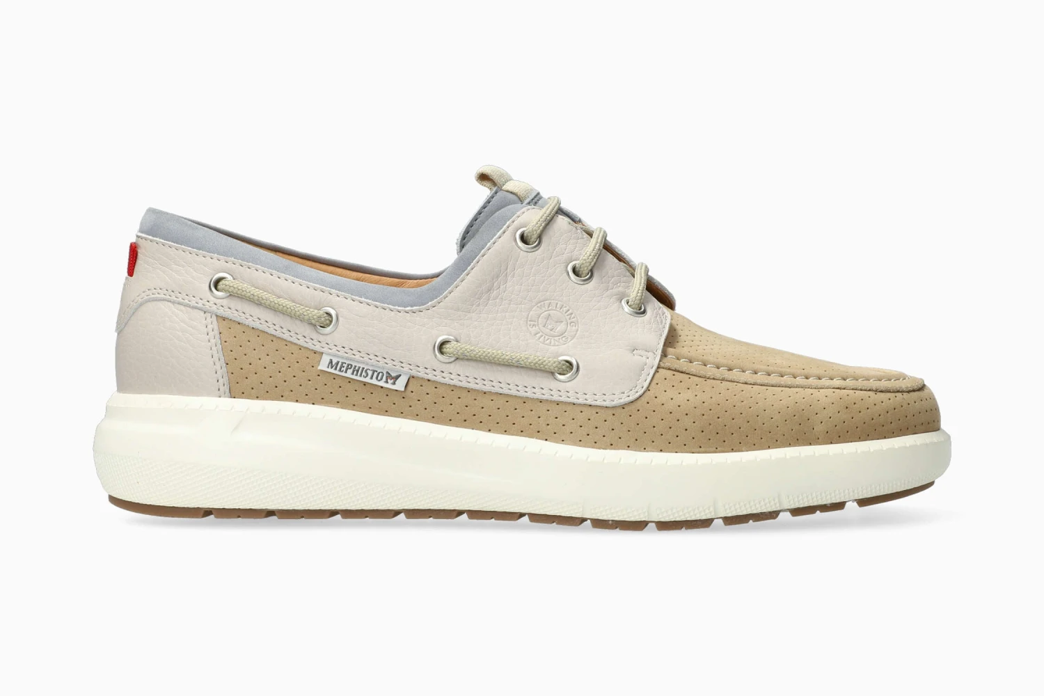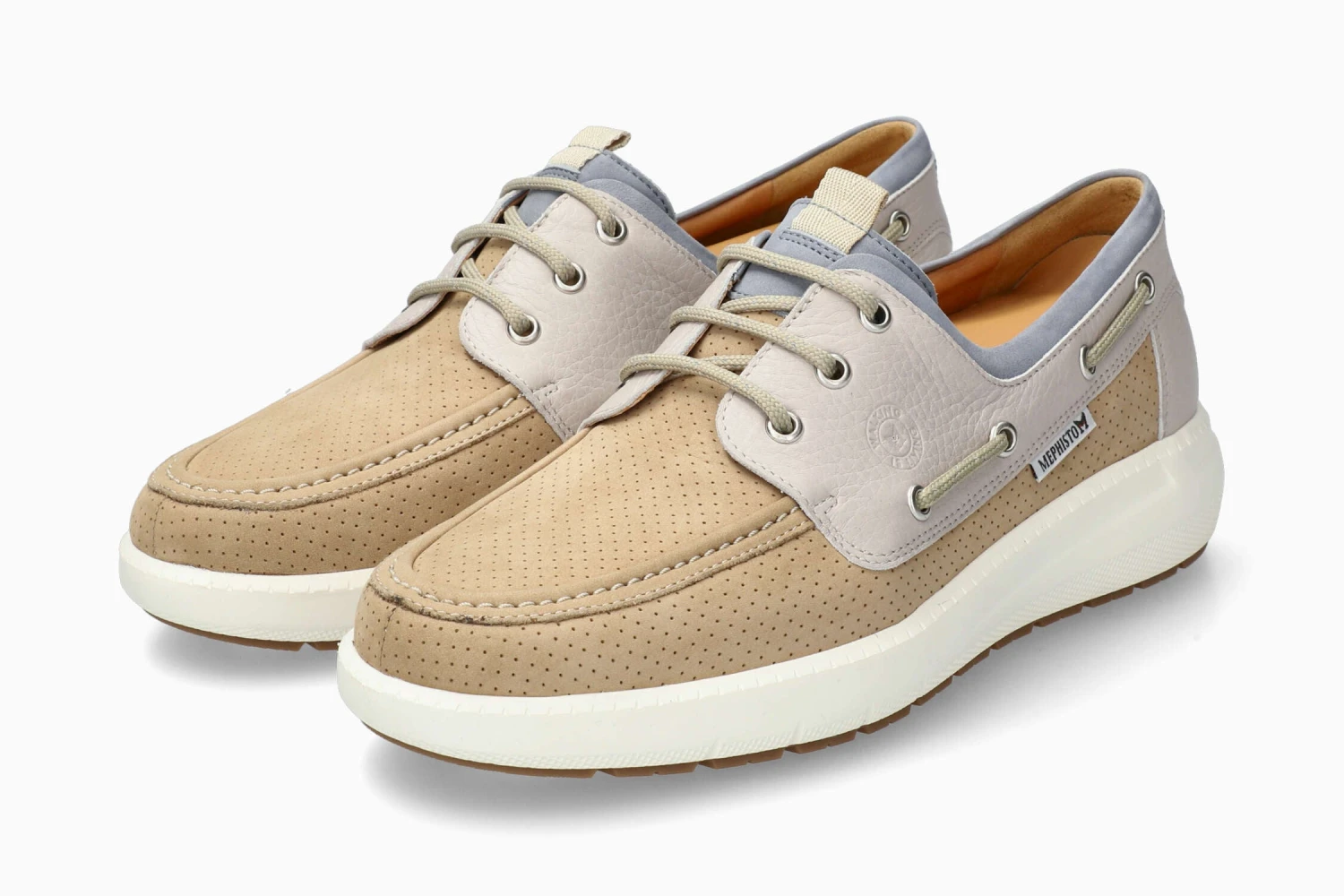 This boat-style shoe has a timeless design that appeals to both classic and modern men. The SOFT-AIR midsole and SHOCK-ABSORBER help reduce shock to a minimum for a smooth, fatigue-free walk. AIR-RELAX technology respects the anatomy of the foot to prevent arch collapse. The lacing ensures quick, pressure-free fastening and adapts perfectly to the anatomy of the foot. The genuine leather lining guarantees a high standard of quality and comfort. This sand-hued model for men is made of nubuck leather on the front and top of the foot, with smooth grained leather on the sides and back of the foot.