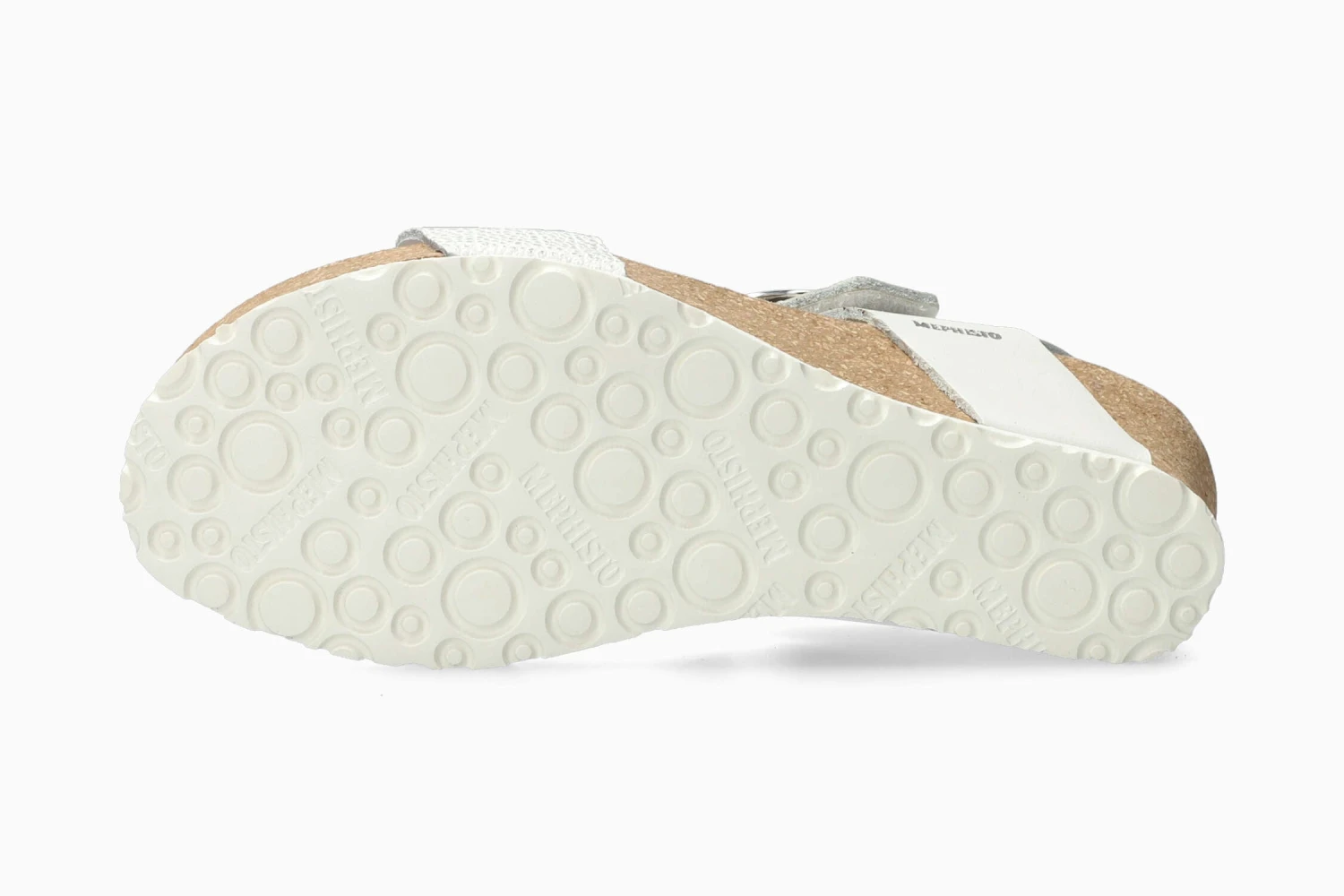 Feminine and perforated, this wedge-heeled sandal guarantees an ideal fit. The unique SOFT-AIR technology integrated into the cork arch ensures fatigue-free walking. AIR-RELAX technology respects the anatomy of the foot to prevent arch collapse. Hook-and-loop fastening with decorative buckle. This metallic-look model for women is made of fancy-print metallic-effect leather on the front of the foot and smooth leather on the back.