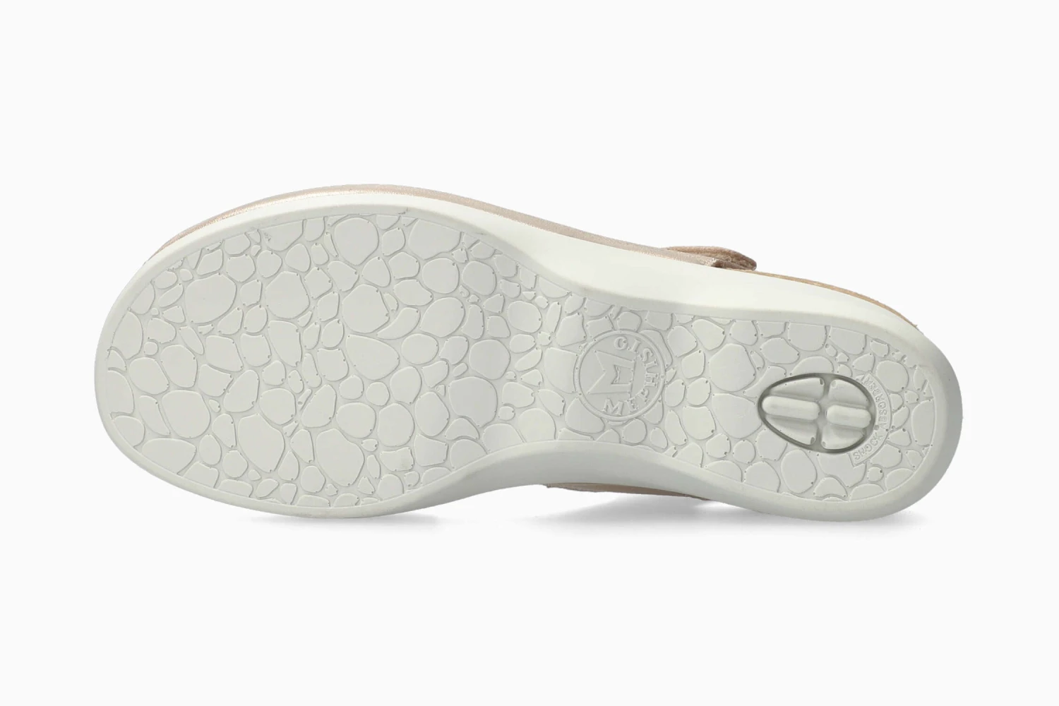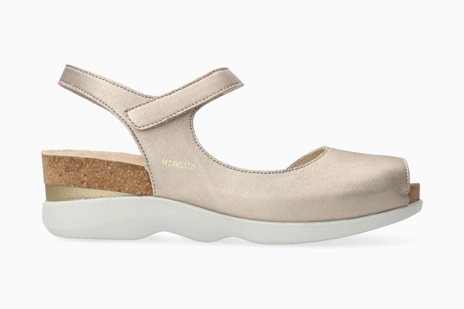 Feminine and elegant, this wedge heel sandal guarantees an ideal fit. Enjoy unparalleled comfort thanks to the SHOCK-ABSORBER, in the outsole, and its SOFT-AIR midsole, which help to reduce impact from walking. The AIR-RELAX technology respects the anatomy of the foot to prevent fallen arches. The adjustable adhesive strap ensures an excellent fit. The leather lining ensures a healthy climate inside the shoe.