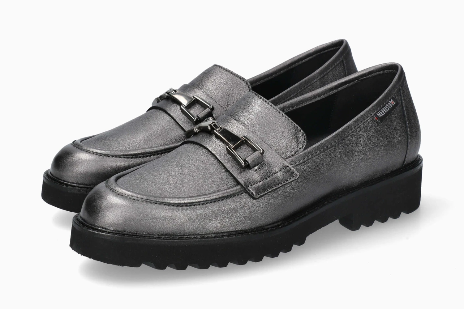 Feminine and elegant, this moccasin offers exceptional quality and optimum comfort. The SHOCK-ABSORBER in the outsole, combined with the removable insole featuring SOFT-AIR Technology, help to absorb the shocks inherent in walking. The leather lining ensures a healthy climate inside the shoe. The embellishment on the forefoot is a perfect blend of sophistication and modernity. This grey model for women is made from metallic-effect leather.