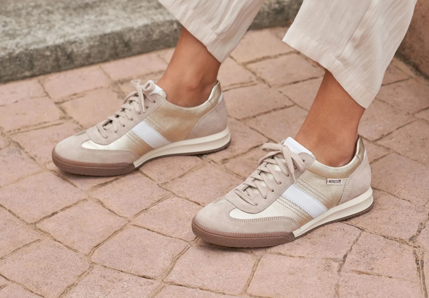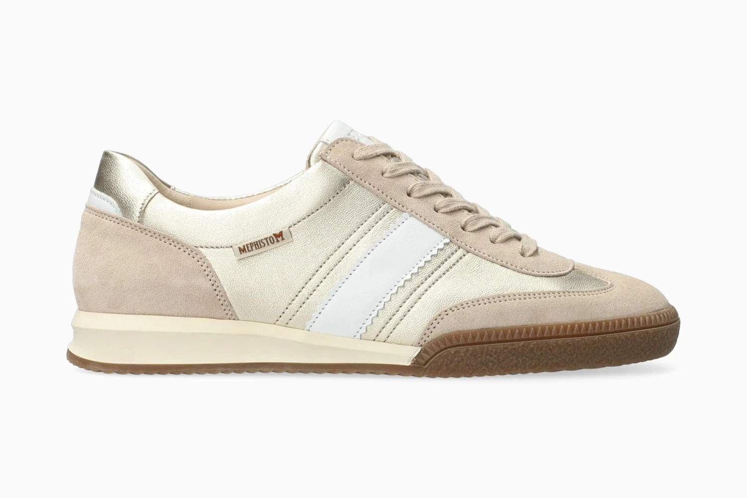 This sneaker has a sporty design with a very successful cut, offering an elegant and original look. The SOFT-AIR midsole and SHOCK-ABSORBER integrated into the outsole reduce shock to a minimum for a smooth, fatigue-free walk. AIR-RELAX technology respects the anatomy of the foot to prevent arch collapse. This lace-up sneaker has a leather lining, a high-grip outsole and excellent cushioning. The leather lining provides a healthy climate inside the shoe. This beige model for women features suede leather all over the foot and touches of gold metallic-effect leather and smooth white leather.