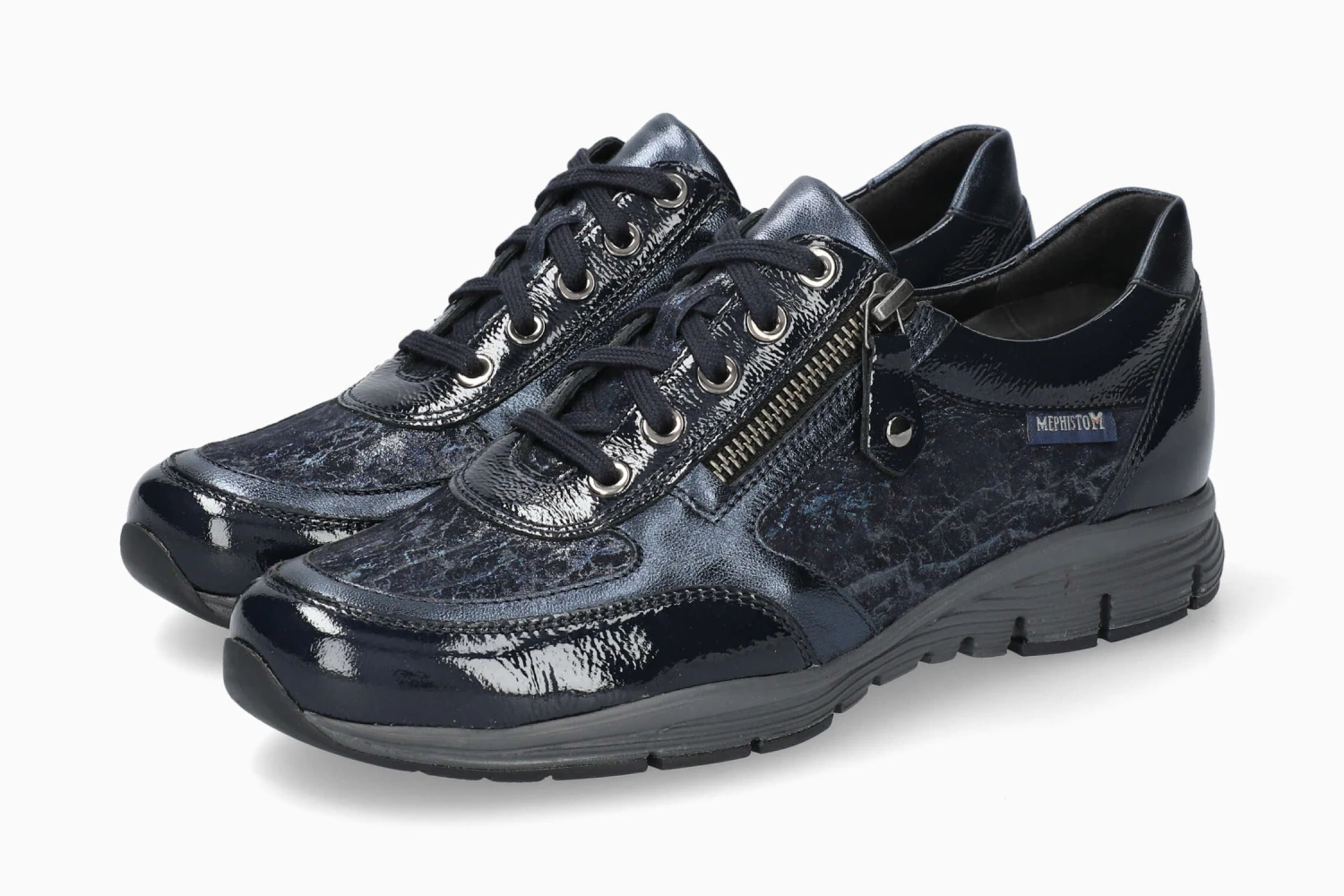 A lot of sneakers are designed to go unnoticed – to be functional and comfortable but not make a scene. The Ylona didn’t get that memo. Ultra-lightweight, well-built, and sporty? Absolutely. Fun, flashy, and modern? Different leather finishes are combined with pops of pattern and color for an unmistakable entrance. A side zipper adds to the punky charm, while also making the on/off routine a snap. Exclusive AIR-JET technology in the footbed keeps fresh air circulating throughout, while a shock absorbing insert in the outsole protects soaks up your strides and takes the strain out of a day spent on the go. This blue women’s model is made from crinkled patent leather over the whole foot, with inserts in fancy-print metallic-effect leather and metallic-effect leather.
